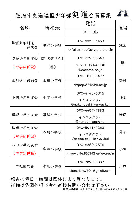 周知事項:令和7年度防府市剣道連盟水曜会のご案内